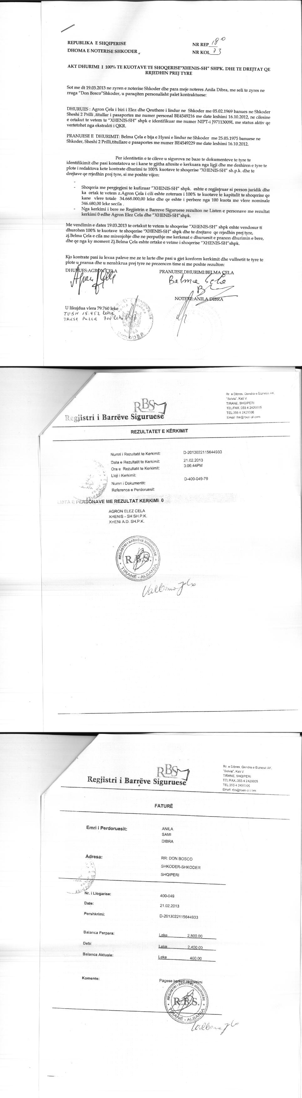 | Çështje Ligjore: | I. Sipas Urdherit Nr.1111 Prot., Nr.744 Dosje, datë 01.08.2016, lëshuar nga Përmbarues Gjyqësor Atin Vako , u urdherua vendosja e sekuestros konservative mbi te gjitha aksionet e zoteruara nga debitori Shoqeria "XHENIS-SH" shpk me nipt J97113009L, dhe Zj. Margerita Mlloja si Administratore e shoqerise. II. Sipas urdhrit Nr. 1111 Prot. date 01.08.2016, leshuar nga permbaruesi gjyqesor Altin Vako, protokolluar nga QKB me Nr. 5763 Prot. date 12 08.08.2016, u vendos masa e sekuestros konservative mbi te gjitha aksionet e zoteruara nga debitori, shoqeria "Xhenis-Sh" sh.p.k, me NUIS (NIPT) J97113009L dhe znj. Margerita Mlloja ne cilesine e administratorit te shoqerise "Xhenis-Sh" sh.p.k III. Sipas urdhrit Nr. 1155 Prot. date 04.08.2016, leshuar nga permbaruesi gjyqesor Altin Vako, protokolluar nga QKB me Nr. 5885 Prot. date 09.08.2016, u zhbllokuan aksionet e shoqerise "Xhenis-Sh" sh.p.k, me NUIS (NIPT) J97113009L dhe znj. Margerita Mlloja ne cilesine e administratorit te shoqerise "Xhenis-Sh" sh.p.k , te bllokuara me ane te shkreses Nr. 1111 Prot. date 01.08.2016. |