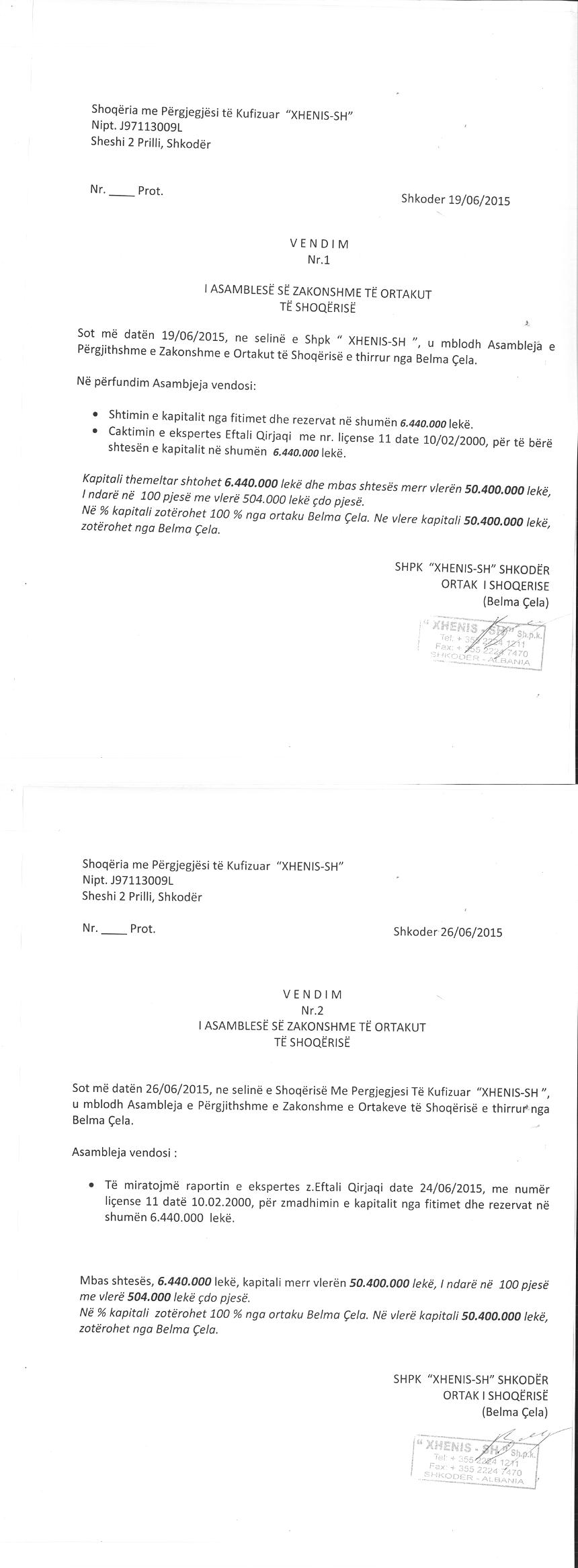 → Ekstrakt Historik i Regjistrit Tregtar date 08.09.2025 → Vendim per Regjistrimin e Shoqerise → Vendim per zmadhimin e kapitalit date 04.10.2006 → Vendim per zmadhimin e kapitalit date 26.09.2006 → Vendim per zmadhimin e kapitalit date 25.06.2009 → Ekstrakt historik i regjistrit tregtar date 25.12.2025 → Akti i dhurimit te kuotave te kapitalit date 19.03.2013 → Vendim i asamblese se ortakut per rritjen e kapitalit date 19.06.2015 → Urdher per venien e sekuestros konservative date 01.08.2016 → Urdher per venien e sekuestros konservative date 01.08.2016 → Vendim per pushimin e ekzekutimit date 04.08.2016 → Vendim i asamblese se ortakeve per shtimin e kapitalit date 26.03.2023 |