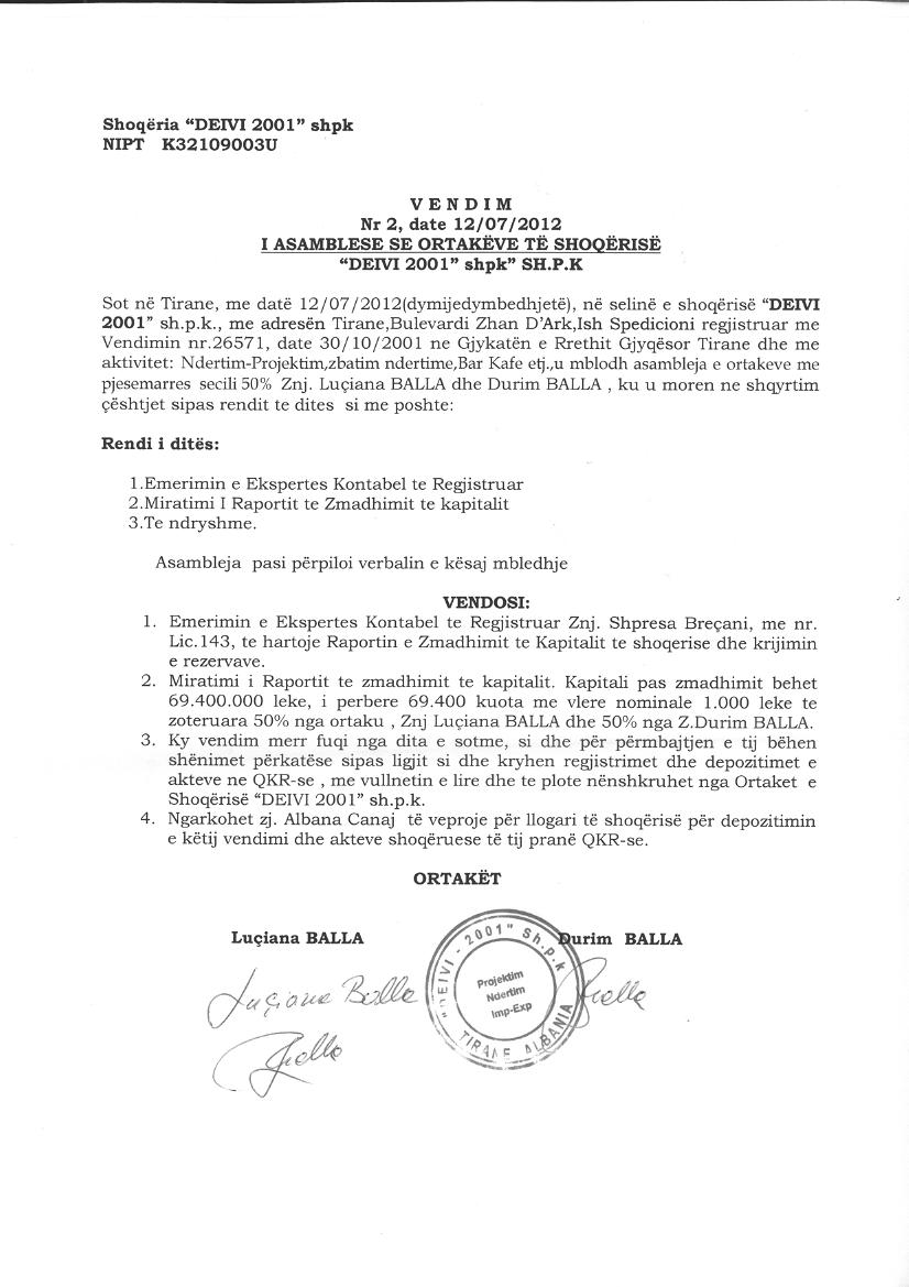 → Ekstrakt historik i regjistrit tregtar date 21.02.2026 → Vendimi i asamblese se ortakeve per zmadhimin e kapitalit date 02.08.2010 → Vendimi i asamblese se ortakeve per zmadhimin e kapitalit date 12.07.2012 → Vendimi i ortakut te vetem per miratimin e rritjes se kapitalit date 13.11.2024 → Vendim i KKT Nr 49, date 25.09.2024, Për Miratimin E Rishikimit Të Kushteve Gjatë Ndërtimit Për Objektin: "Hotel 9 Kate Mbi Tokë Dhe 2 Kate Nëntokë Me Pishinë “Royal 5g”, Shkëmbi I Kavajës, Bashkia Durrës" → Harta e Planvendosjes Vendim KKT Nr. 49, date 25.09.2024 |