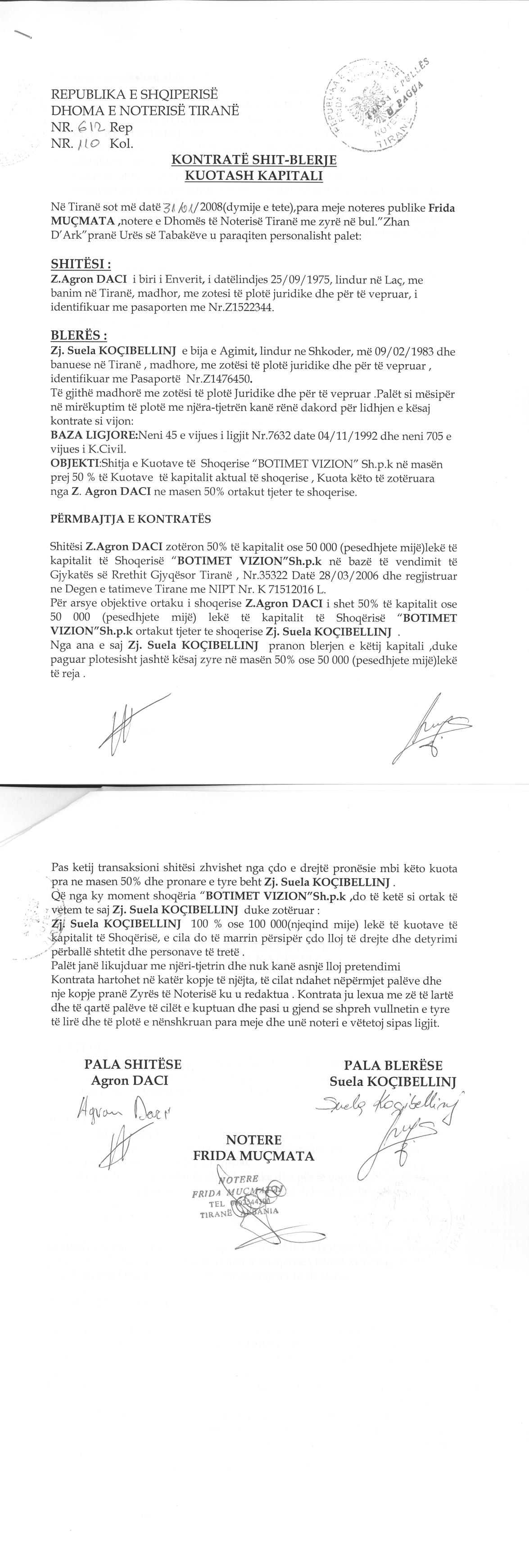 → Ekstrakt Historik i Regjistrit Tregtar date 11.11.2025 → Ekstrakt historik i regjistrit tregtar date 08.12.2025 → Kontrate shitblerje kuotash kapitalit date 31.01.2008 → Vendimi per fillimin e procesit te likujdimit te dates 01.10.2009 → Vendimi per miratimin e raportit te likujdimit te shoqerise date 20.04.2010 |