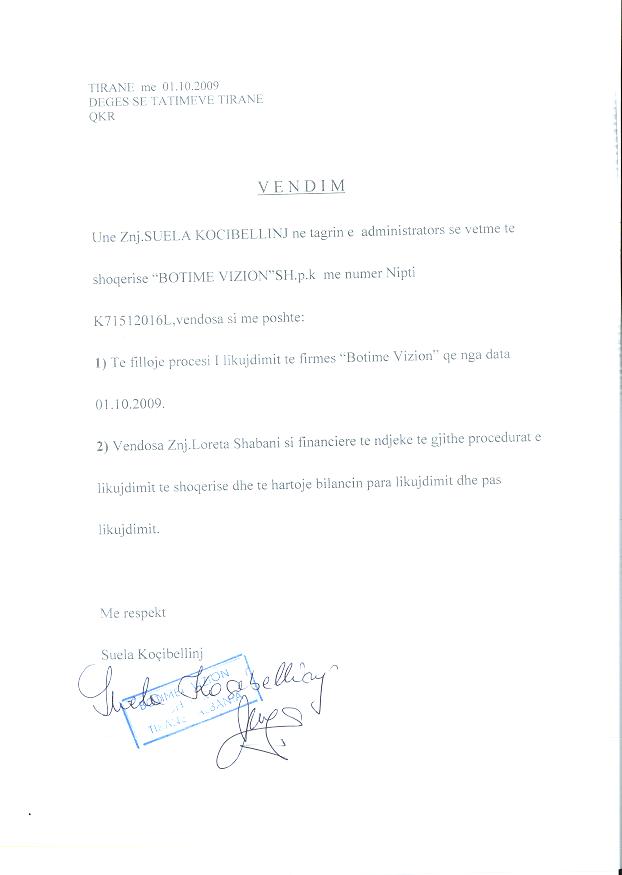 | Çështje Ligjore: | I. Me date 01.10.2009, u fillua procesi i likujdimit te shoqerise “Botime Vizion” dhe u vendos Znj. Loreta Shabani si financiere te ndjeke te gjithe procedurat e likujdimit te shoqerise. Statusi i shoqerise kaloi nga “Aktiv” ne “Shoqeri ne likuidim e siper”. II. Me date 20.04.2010, me vendim te ortakut te vetem, u miratua raporti i likujdimit te shoqerise “Botimet Vizion” shpk dhe u hoq mandati i likuidatores Z. Loreta Shabani. Statusi i shoqerise kaloi nga “Shoqeri ne Likuidim e Siper” ne “C’regjistruar”. |