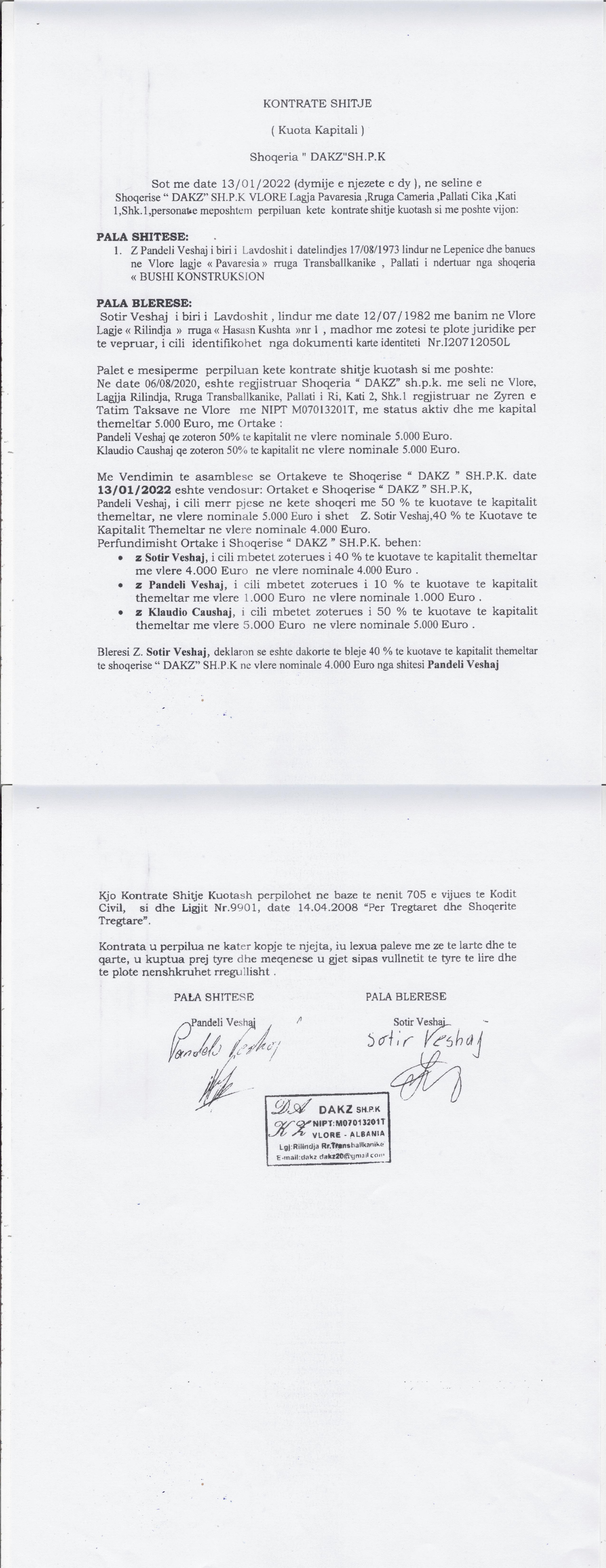 → Ekstrakti Historik I Regjistrit Tregtar date 26.08.2020 → Statuti I Shoqerise → Ekstrakt historik i regjistrit tregtar date 14.02.2026 → Kontrate shitje kuotash kapitali date 13.01.2022 → Kontrate shitje kuotash kapitali date 06.09.2022 → Kontrate shitje kuotash kapitali date 13.03.2024 → Kontrate shitje kuotash kapitali date 14.04.2024 → Kontrate shitje kuotash kapitali date 16.10.2025 → Kontrate shitje kuotash kapitali date 13.11.2025 → Kontrate shitje kuotash kapitali date 29.01.2026 → Vendim KKT Nr 26, date 25.09.2024, Leje Ndertimi per Objektin: Kompleks Rezidencial sherbime hoteleri dhe banim, 1, 2 dhe 23-24 kate mbi toke me 3 kate parkim dhe sherbime nentoke", Bashkia Vlore. → Harta e Planvendosjes, Vendimi Nr.26, Date 25.09.2024 |