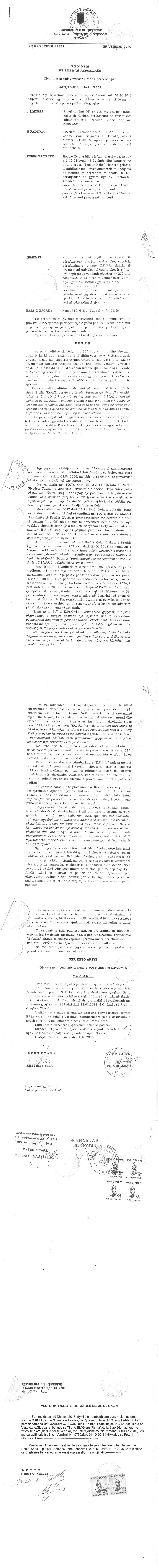 | Çështje Ligjore: | I. Sipas Urdhrit Nr.2795 Prot., Nr.Dosje 533, date 11.03.2013, lëshuar nga Shoqëria Përmbaruese Private “E.P.S.A” sh.p.k., u urdherua vendosja e sekuestros mbi kuotat qe zoteron ne cdo subjekt tregtar Shoqeria “Ina-96” sh.p.k., me NUIS(NIPT)-J69324408U, me perf. Brunilda Gjineci, si dhe mbi te 6 drejtat qe rrjedhin nga zoterimi i ketyre kuotave duke ndaluar tjetersimin ose disponimin e tyre si dhe ushtrimin e te drejtave qe rrjedhin nga keto kuota”. II. Sipas Urdhrit Nr.11243 Prot., Nr.Dosje 533, date 02.12.2013, lëshuar nga Shoqëria Përmbaruese Private “E.P.S.A” sh.p.k., u vendos sekuestro mbi kuotat qe zoteron ne cdo subjekt tregtar debitori Shoqeria “INA - 96” sh.p.k., me NUIS(NIPT)- J69324408U, me perfaqesues ligjor Brunilda Gjineci, si dhe mbi te drejtat qe rrjedhin nga zoterimi i ketyre kuotave duke ndaluar tjetersimin ose disponimin e tyre si dhe ushtrimin e te drejtave qe rrjedhin nga keto kuota”. III. Sipas Vendimit Nr.9739, date 01.10.2013, te Gjykates se Rrethit Gjyqesor Tirane, u vendos pranimi i padise se pales paditese shoqeria “Ina 96” sh.p.k dhe anullimin e veprimeve permbarimore te kryera nga shoqeria permbarimore private “E.P.S.A.” sh.p.k. (permbarues gjyqesor Gelaz Yzo), te kryera ndaj pales paditese shoqeria “Ina 96” sh.p.k., ne zbatim te titullit ekzekutiv per te cilin eshte leshuar urdhri i ekzekutimit me vendimin gjyqesor nr.239 akti, date 23.01.2013 te Gjykates se Rrethit Gjyqesor Tirane dhe urdherimin e pales se paditur shoqeria permbarimore private “E.P.S.A.” sh.p.k., te rifilloje veprimet permbarimore per ekzekutimin e titullit ekzekutiv me lajmerimin per ekzekutim vullnetar. IV. Sipas Urdhrit Nr.1028, datë 24.03.2016, lëshuar nga Përmbarues Gjyqësor Privat Zef Macaj, u urdherua vendosja e sekuestros konservative mbi kapitalin dhe kuotat e debitorit Shoqeria “ Ina – 96” shpk, me Nipt : J69324408U, ne masen e detyrimit 3 918 283 (Tre million e nenteqind e tetembedhjete mije e dyqind e tetedhjete e tre) leke. V. Sipas Urdhrit Nr.1354, date 03.02.2017 protokolluar nga QKB me Nr. 1807Prot., date 07.02.2017, leshuar nga permbarues gjyqesor Zef Macaj, ku eshte urdheruar: Heqja e sekuestros konservative e vendosur mbi kapitalin dhe aksionet e debitorit Shoqeria “INA-96”shpk me Nipt J69324408U. |