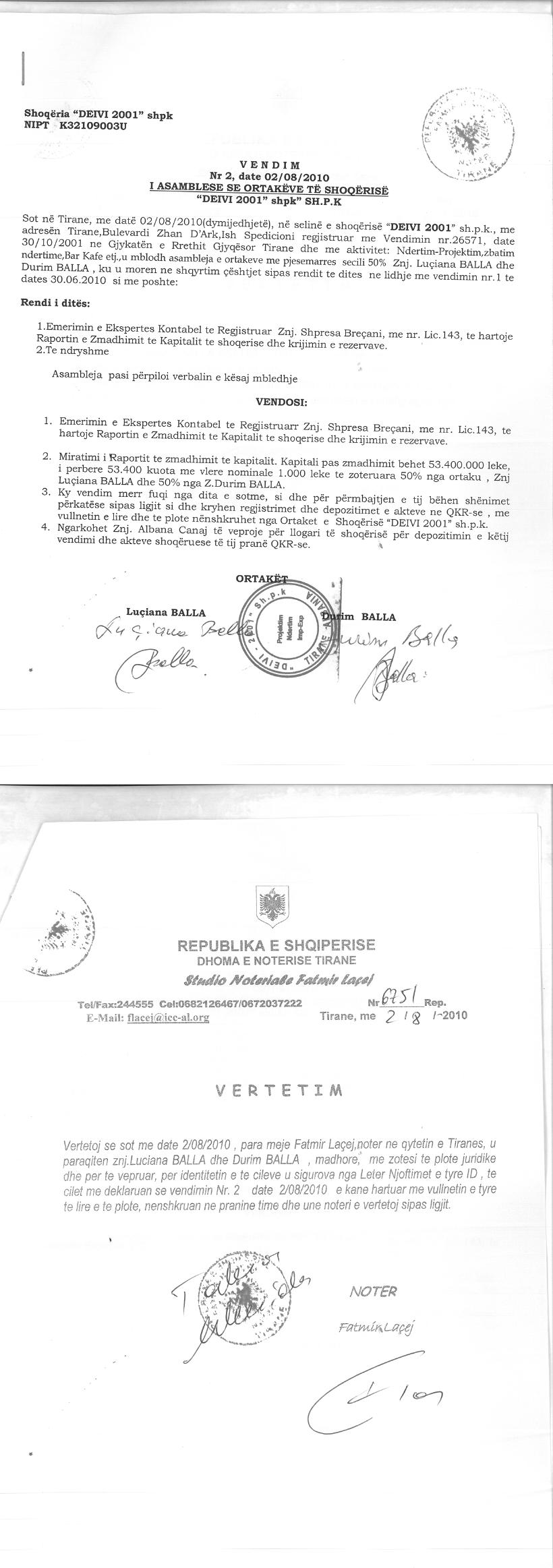 → Ekstrakt historik i regjistrit tregtar date 21.02.2026 → Vendimi i asamblese se ortakeve per zmadhimin e kapitalit date 02.08.2010 → Vendimi i asamblese se ortakeve per zmadhimin e kapitalit date 12.07.2012 → Vendimi i ortakut te vetem per miratimin e rritjes se kapitalit date 13.11.2024 → Vendim i KKT Nr 49, date 25.09.2024, Për Miratimin E Rishikimit Të Kushteve Gjatë Ndërtimit Për Objektin: "Hotel 9 Kate Mbi Tokë Dhe 2 Kate Nëntokë Me Pishinë “Royal 5g”, Shkëmbi I Kavajës, Bashkia Durrës" → Harta e Planvendosjes Vendim KKT Nr. 49, date 25.09.2024 |