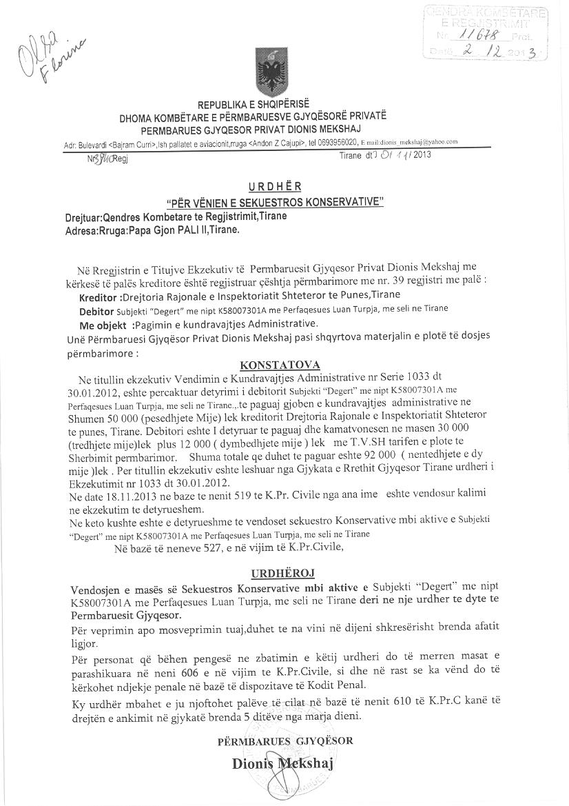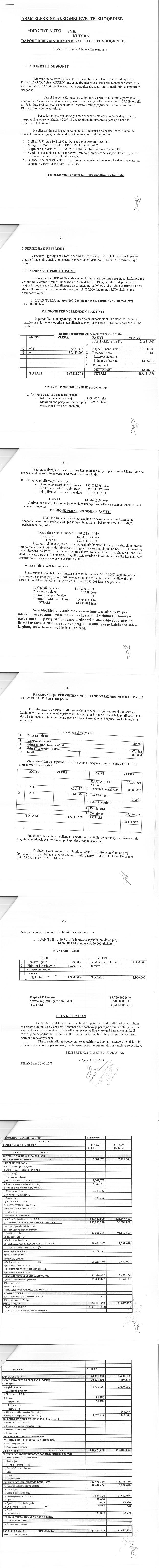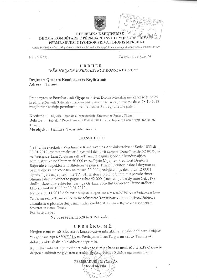 Çështje Ligjore: | I. Me date 01.10.2006, me vendim te aksionerit te vetem, miratua raporti i ekspertit kontabel per bashkimin me perthithje te shoqerise "DEGERT AUTO" SHA dhe shoqerise "DEGERT AUTO" SHPK ku shoqeria me pergjegjesi te kufizuar eshte shoqeria e perthithur. a. Objekti i veprimtarise se shoqerise perthithese "DEGERT AUTO" sha do te jete ai i te dy shoqerise "DEGERT AUTO" SHA dhe "DEGERT AUTO" SHPK. b. Kapitali i shoqerise behet gjithsej 16.500.000 leke ku zoterohet perkatesisht nga aksioneri i vetem z. Luan Turja. c. Keshilli mbikqyres do te jete: Dritan Tomja, Valbona Lala, Alisabeta Turja Drejtor - Luan Turja II. Sipas Urdhërit Nr.3940 Regj., datë 30.11.2013, lëshuar nga Përmbarues Gjyqësor Privat Dionis Mekshaj, u urdherua vendosja e masës së sekuestros konservative mbi aktivet e subjektit "DEGERT AUTO" sh.a me NUIS (NIPT) - K58007301A me përfaqësues ligjor Luan Turja deri në një urdhër të dytë të Përmbaruesit Gjyqësor.” Objekti i sekuestros: Pagimi i kundravajtjes administrative. III. Sipas Urdhrit Nr.39 Regj., datë 12.03.2014, lëshuar nga Përmbaruesi Gjyqësor Privat DIONIS MEKSHAJ, u urdherua heqja e masës së sekuestros mbi aktivet e palës debitore, subjektit “DEGERT AUTO” sh.a., me NUIS (NIPT) K58007301A. |