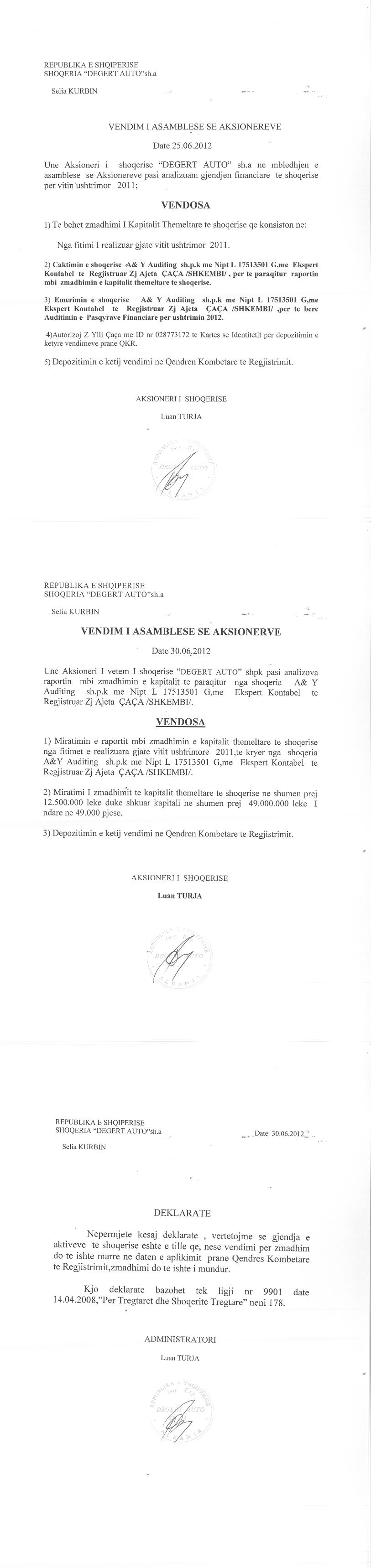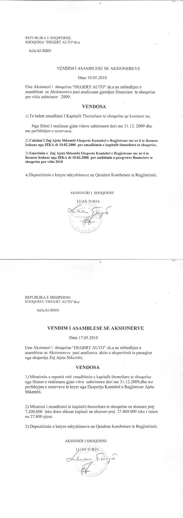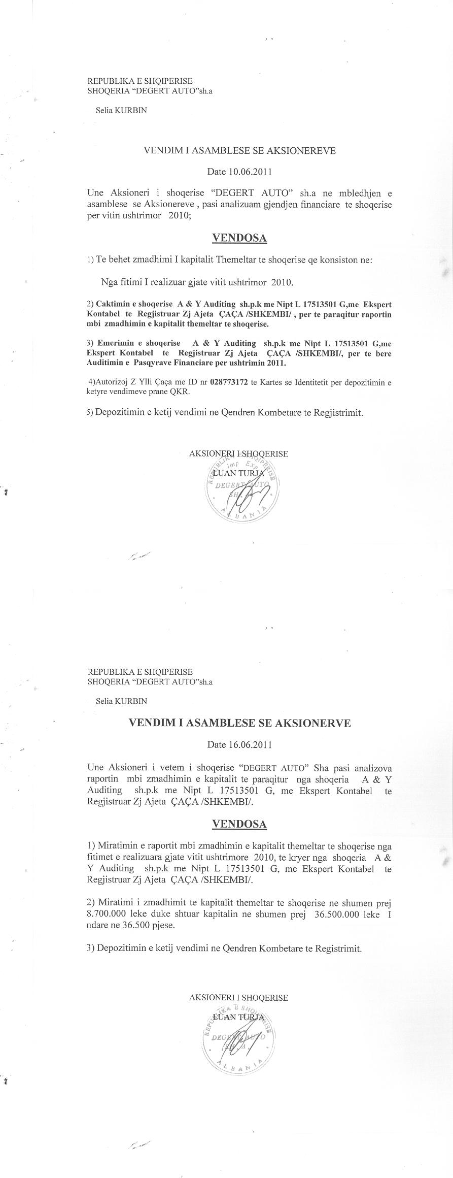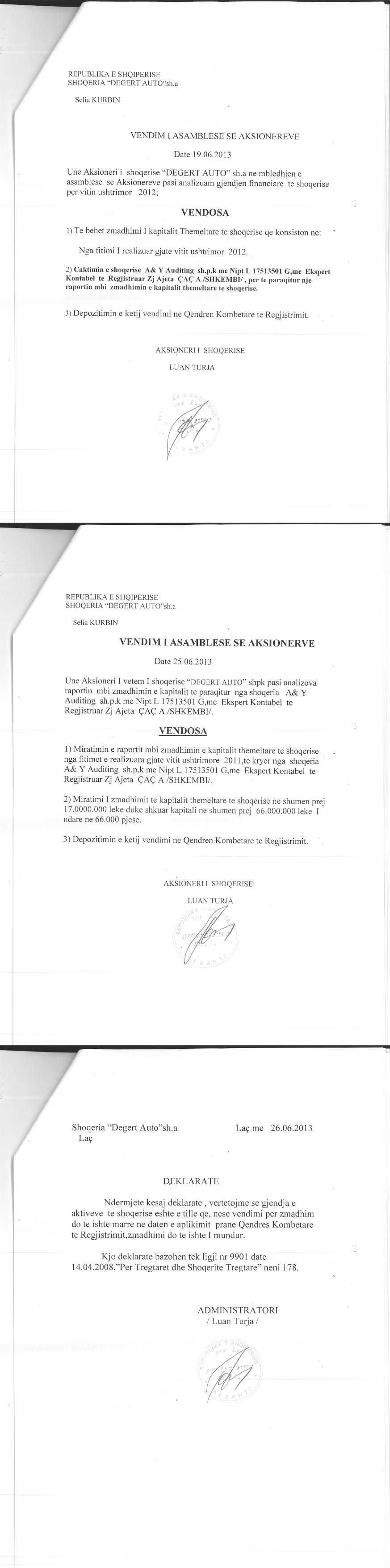 → Ekstrakt historik i regjistrit tregtar date 03.09.2025 → Akti i themelimit dhe statuti → Vendimi i asamblese se aksionareve per bashkimin me perthithje date 01.10.2006 → Raport i ekspertit kontabel per zmadhimin e kapitalit, date 30.06.2008 → Vendimi i asamblese se aksionareve per zmadhimin e kapitalit, date 10.05.2010 → Vendimi i asamblese se aksinareve per zmadhimin e kapitalit, date 10.06.2011 → Vendimi i asamblese se aksionareve per zmadhimin e kapitalit, date 25.06.2012 → Vendimi i asamblese se aksionareve per zmadhimin e kapitalit, date 19.06.2013 → Urdher per venien e sekuestros konservative date 30.11.2013 → Urdher per heqjen e sekuestros konservative, date 12.03.2014 → Deshmia e Trashegimise Ligjore, date 26.10.2021 |