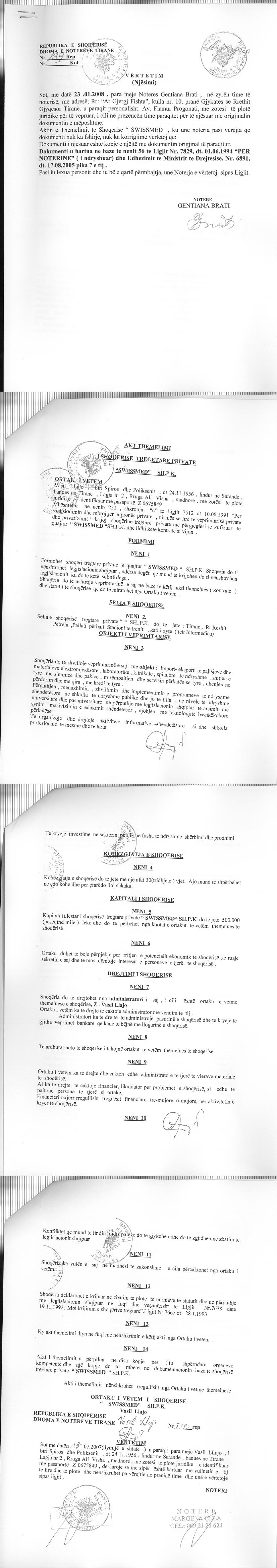 | Objekti i Veprimtarisë: | Import, eksport, tregti me shumice dhe pakice te: pajisjeve mjekesore dhe laboratorike, kimikateve, kiteve, reagenteve, mjekesore edhe veterinare, standarteve, konsumableve medicinale, testeve, artikujve te ndryshem per ambjente laboratori, pajisjeve te imazherise, gjeneratoreve me rreze X, aksesoreve te ndryshem, instrumentesh, aparaturash, mobilje dhe pajisje kompjuterike per laboratore dhe industri te ndryshme, mallrave me perdorim te dyfishte etj. Dhenie ne perdorim dhe me qera te te gjitha llojeve te aparaturave ne pronesi te Swissmed shpk. Monitorime te gjendjes se mjedisit, konsulenca mjedisore, auditime mjedisore, pergatitje raportesh vetmonitorimi sipas kushteve te lejeve mjedisore. Organizim trajnimesh profesionale per Swissmed dhe/ose per llogari te treteve. Kryerja e montimeve, instalimeve, riparimeve, mirembajtjeve, kalibrimeve dhe asistences teknike per te gjitha llojet e pajisjeve, aparaturave, makinerive, impianteve dhe sistemeve te ndryshme, pajisjeve monitoruese te ajrit, ujit dhe pajisjeve te mbrojtjes ne pune. Tregetim te pajisjeve industriale per prodhimin e kimikateve, medikamenteve dhe industrise ushqimore. Investime, sherbime, projekte ne fushen e mjekesise dhe shendetit, krijimi dhe menaxhimi i klinikave private. Me qellim realizimin e objektit te aktivitetit te saj, shoqeria mund te kryeje cdo veprimtari te nevojshme e te dobishme, te lejuar nga ligji. |