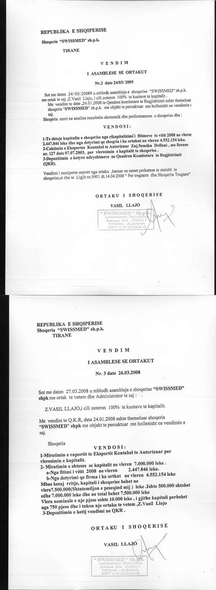 → Ekstrakt Historik i Regjistrit Tregtar date 16.05.2025 → Kontrate dhurimi Kuotash date 04.09.2018 → Vendimi per zmadhimin e kapitalit date 28.08.2019 → Kontrate dhurimi kuotash date 12.12.2022 → Ekstrakt Historik i Regjistrit Tregtar date 23.08.2025 → Akt themelimi i Shoqerise → Vendim i Asamblesë së Ortakut për Zmadhimin e Kapitalit datë 24.03.2009 → Vendim i Ortakut të Vetëm për Zmadhimin e Kapitalit datë 01.10.2011 → Vendim i Ortakut të Vetëm për Zmadhimin e Kapitalit datë 19.10.2013 → Vendim i Ortakut të Vetëm për Zmadhimin e Kapitalit datë 25.05.2016 → Vendim i Ortakut të Vetëm për Zmadhimin e Kapitalit datë 30.06.2017 → Kontratë Dhurimi Kuotash datë 04.09.2018 → Vendim i Ortakut të Vetëm për Zmadhimin e Kapitalit datë 28.08.2019 → Kontratë Dhurimi Kuotash datë 12.12.2022 → Kontratë Shitblerje Kuotash Kapitali datë 23.06.2025 |