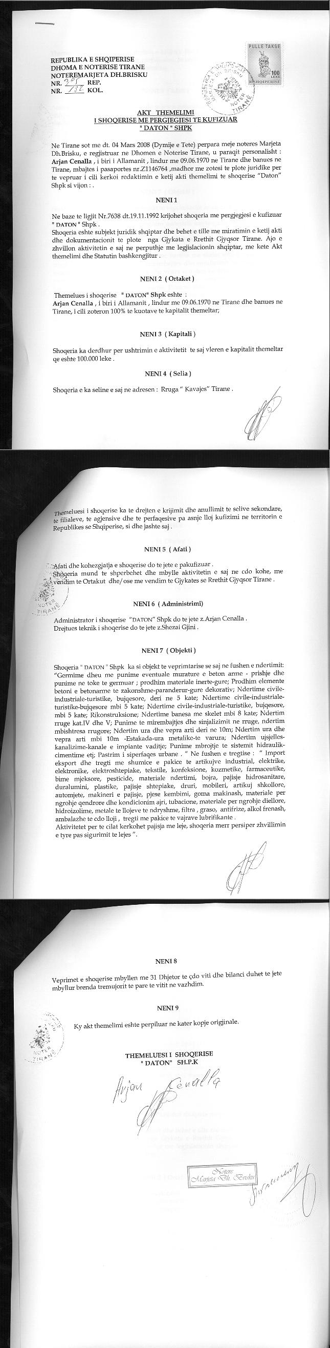 | Shoqëri e Kontrolluar nga ky Subjekt: | I. “COMFORT DEVELOPMENT”, shoqëri me përgjegjësi të kufizuar, e themeluar më datë 11/10/2018, sipas ligjeve të Republikës së Shqipërisë, me numër identifikimi në regjistrin tregtar NIPT L82212026N, me adresë aktuale në Tirane Njesia Administrative Nr.5, Rruga e Kosovareve, Pallati Dolçka, Ap.1/2, 1019, dhe me administrator Alban Efthimi. “DATON” shpk zotëron 50% të kapitalit. (Sipas të dhënave të QKB deri më datë 07.02.2026) II. “ART PLAN”, shoqëri me përgjegjësi të kufizuar, e themeluar më datë 01/03/2023, sipas ligjeve të Republikës së Shqipërisë, me numër identifikimi në regjistrin tregtar NIPT M31520015S, me adresë aktuale në Tirane Rruga e “Kosovarëve”, Pallati Dolçka, Ap.1/2, Njësia Administrative Nr.5, Tirane, dhe me administrator Gerald Mahilaj. “DATON” shpk zotëron 29% të kapitalit. (Sipas të dhënave të QKB deri më datë 07.02.2026) III. “GREEN LIVING COMPANY”, shoqëri me përgjegjësi të kufizuar, e themeluar më datë 15/01/2008, sipas ligjeve të Republikës së Shqipërisë, me numër identifikimi në regjistrin tregtar NIPT K81317005Q, me adresë aktuale në Tirane Rruga e Kosovarëve, pallati Dolcka, ap. 1/2, dhe me administrator Klevens Toka dhe Orion Cenalla. “DATON” shpk zotëron 25% të kapitalit. (Sipas të dhënave të QKB deri më datë 07.02.2026) |