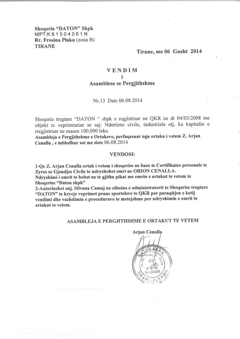 → Ekstrakt Historik i Regjistrit Tregtar date 07.02.2026 → Akt themelimi i Shoqerise → Vendim për miratimin e ndryshimit të emrit të ortakut datë 06.08.2014 → Vendim KKT Nr. 13, dt. 24.04.2024, Leje zhvillimi për strukturë shërbimi dhe hotelerie, 10 kate, Rruga “Frosina Plaku”, Tiranë → Harta e Planvendosjes Vendim KKT Nr. 13, dt. 24.04.2024 |