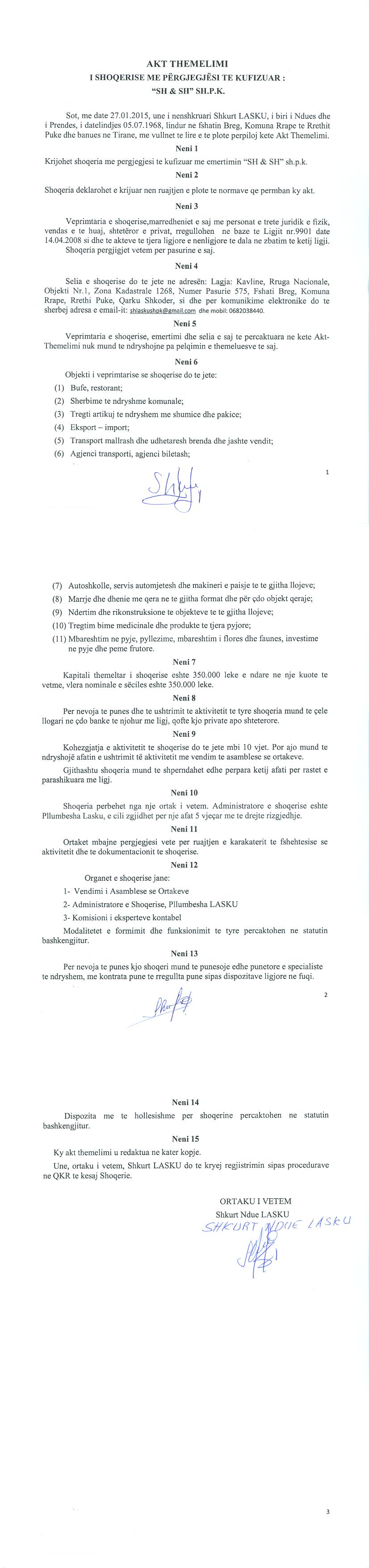 Emërtime të tjera Tregtare: | "SH & SH" SH.P.K. |